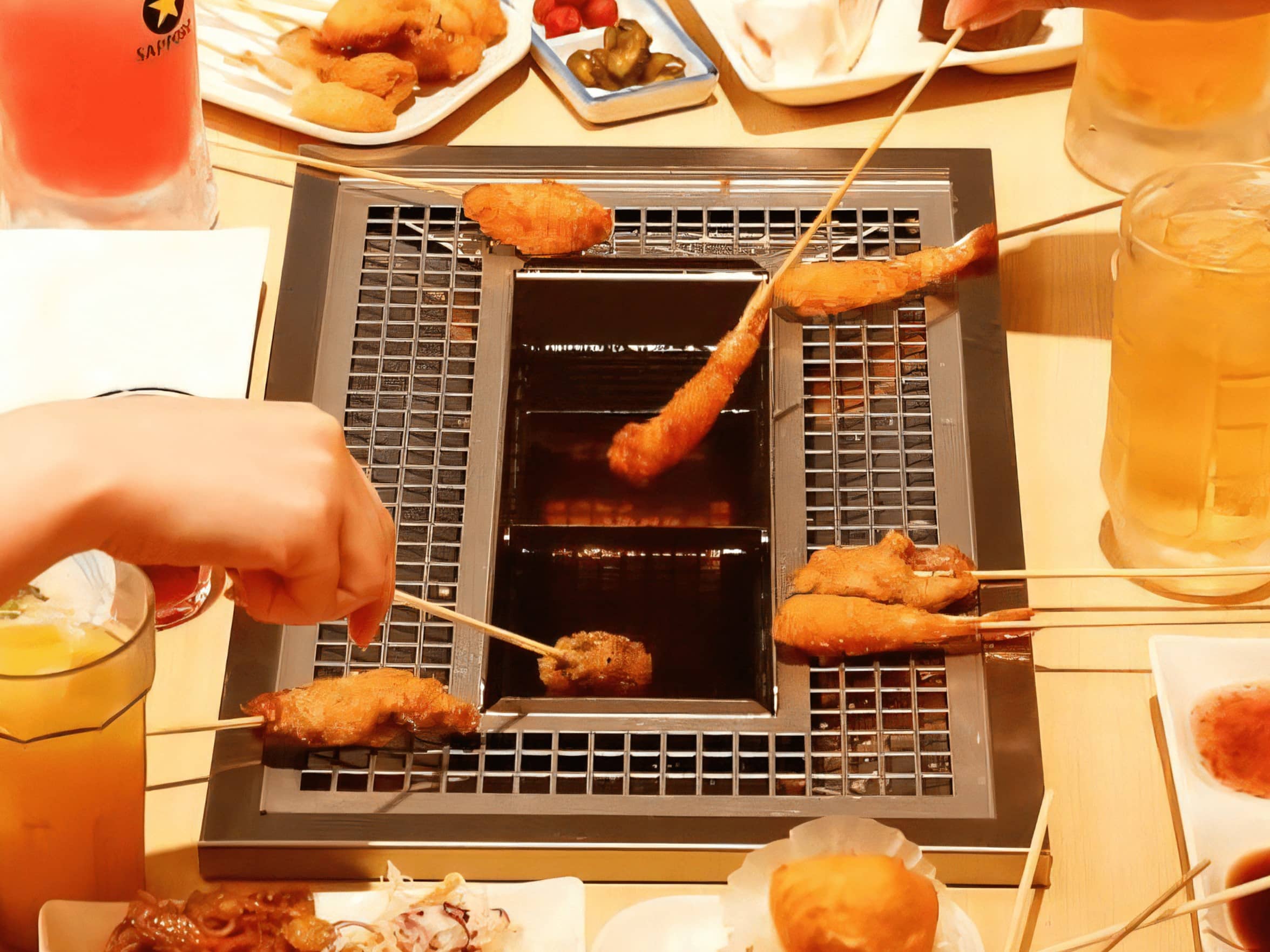 串揚げ、串カツなど30種以上が食べ放題!ビュッフェスタイルでご自分の好きな材料をお好きなだけお楽しみいただけます。ご自身で揚げていただくスタイルですので揚げたてを楽しめますよ♪揚げたら串家物語特製のソースで召し上がれ!ベストな揚げ時間は、『串揚げ時間目安表』がご案内♪テーブル備え付けのフライヤーを囲んで楽しい時間をお過ごしください♪